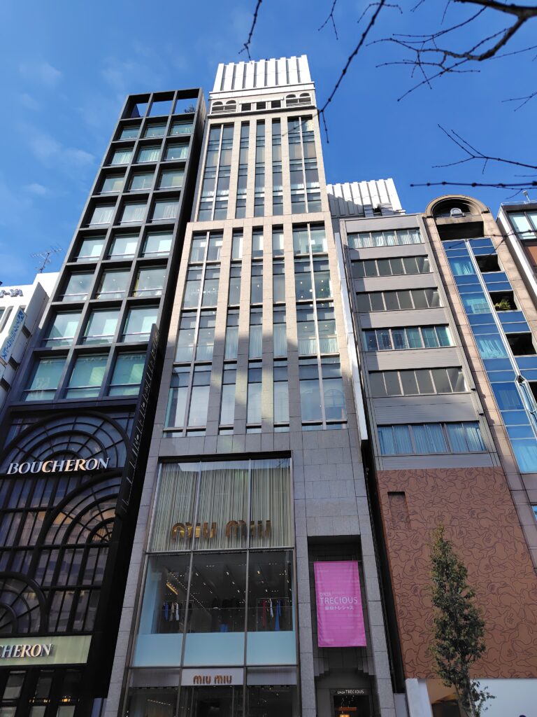 銀座中央通り、銀座一丁目交差点から銀座四丁目方面へ左側歩道を歩くと、すぐに「銀座トレシャス」があります。1階が「MIUMIU」です。