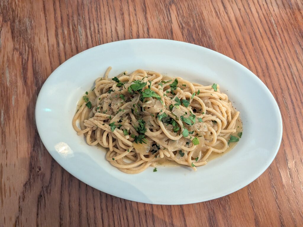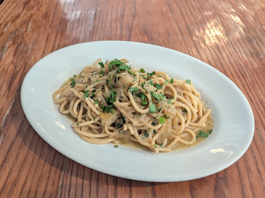 玉葱とアンチョビがざらつきのパスタ表面に絡み美味しいです♪