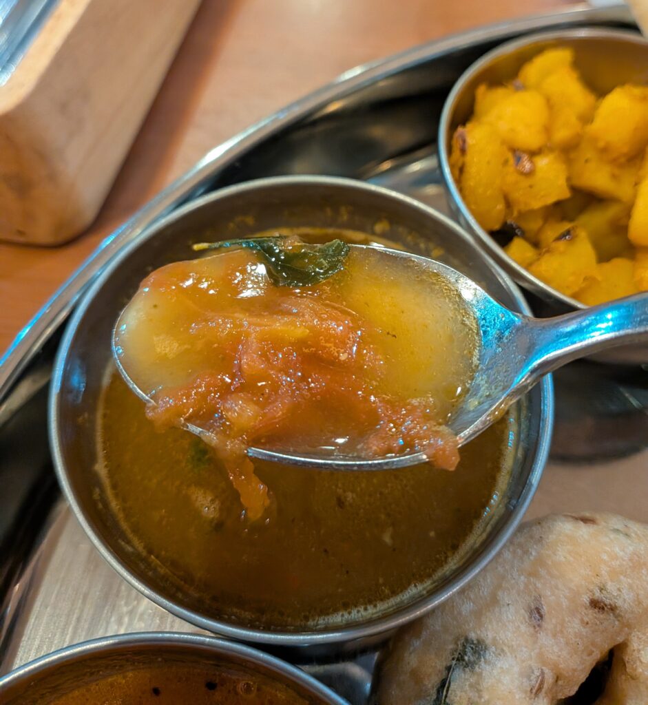 ミニドーサorパロタorチャパティ・ライス・メドゥワダ・サーンバール・ラッサム・ベジクルマ・