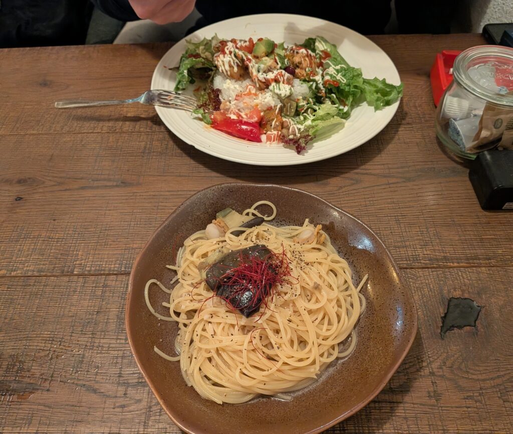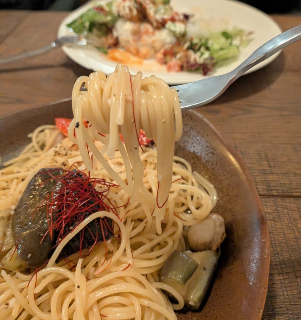 この日のパスタは「茄子とホタテの和風パスタ」