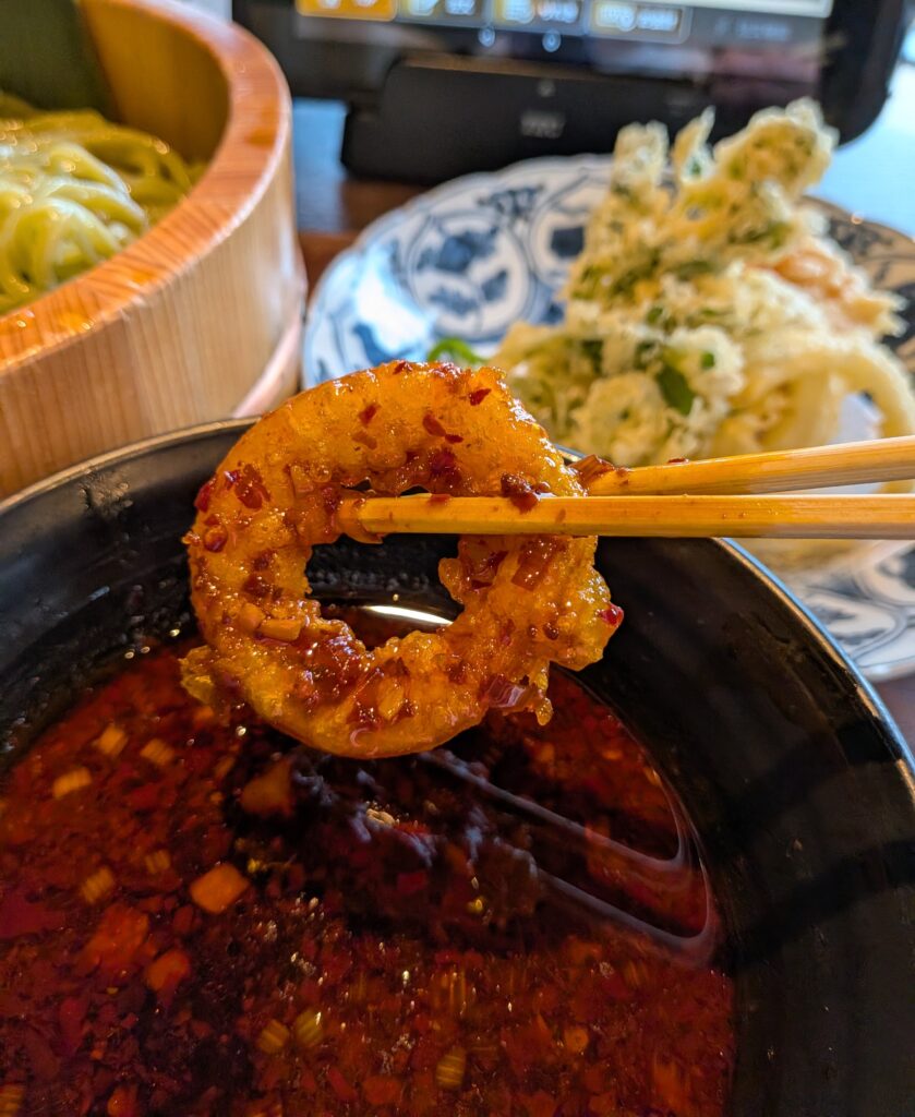 野菜天扶良と共に酸味の利いた旨辛のつけ汁につけて。